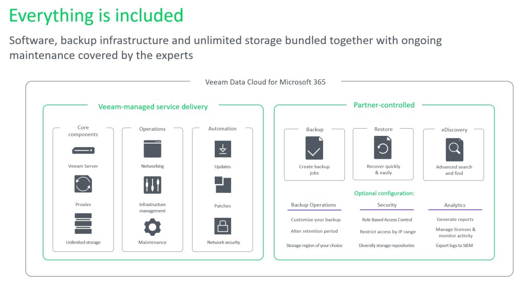 Veeam Data Cloud for Microsoft 365 is a Veeam-managed backup service for protecting Microsoft Exchange, SharePoint, OneDrive for Business and Teams. Veeam manages the backup infrastructure, all data is stored in an Azure region of your choice, and you have full control of creating backups and completing restores. The BaaS user interface is accessible through a web browser.