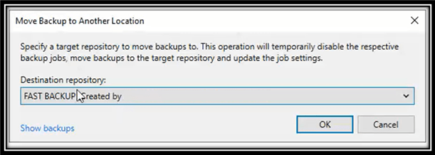 - The Move Backup to Another Location window appears. Here you can select the ReFS/XFS repository you have created. Veeam will reconfigure the backup job to now point to the newly selected ReFS/XFS repository.
