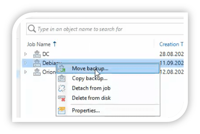- In the working area to the right-hand side, right-click a job and select Move backup or select Move Backup from the top ribbon pane.