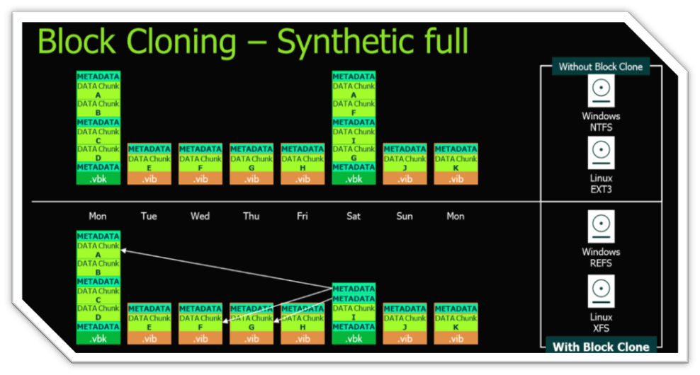 The above graphics compares what a backup looks like in a NTFS/EXT3 formatted filesystem compared to a ReFS/XFS formatted filesystem. Storage savings can be significant.