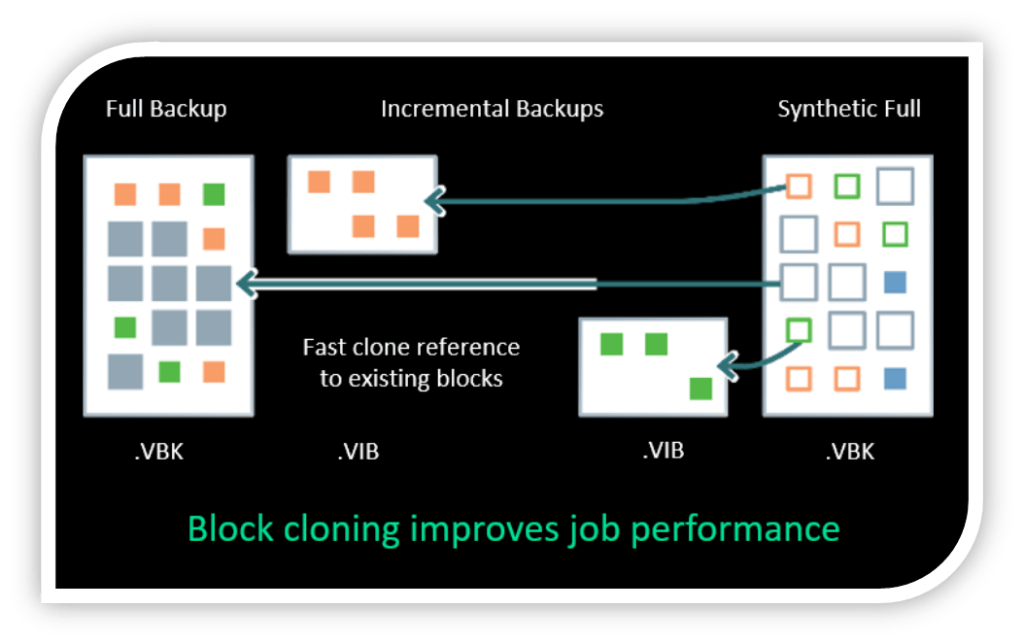 Fast cloning enables Veeam to create synthetic full backups without rehydrating and copying entire files. With this technology, Veeam Backup & Replication references existing data blocks on volumes instead of copying data blocks between files. Data blocks are copied only when files are modified.