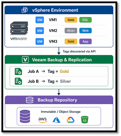 Veeam jobs can then be mapped directly to these tags, ensuring:
